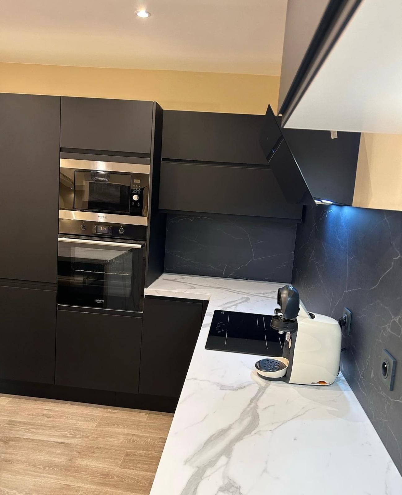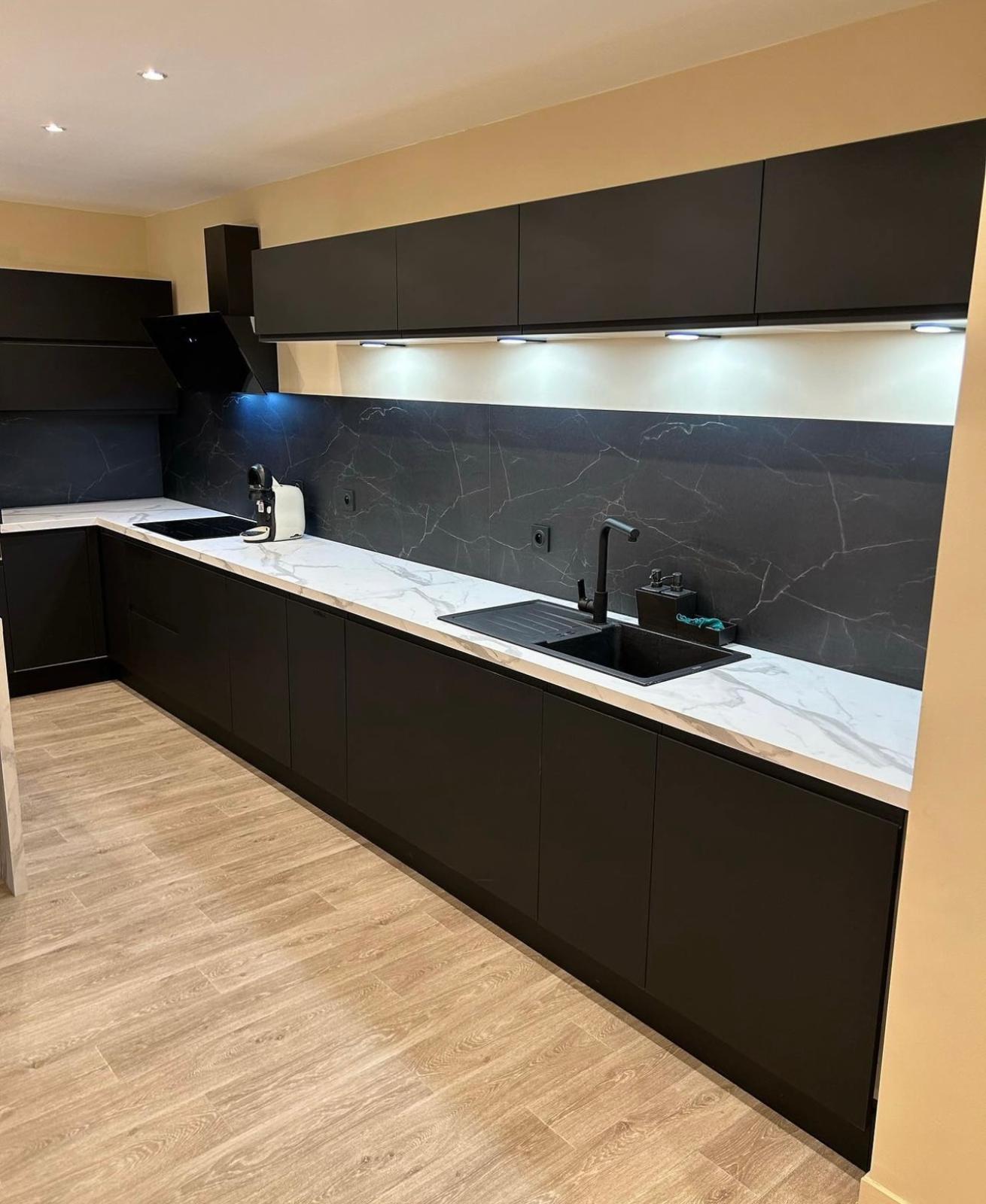Le chantier Pierron illustre parfaitement comment un espace peut être métamorphosé grâce à une conception soignée et des matériaux haut de gamme. Cette rénovation a donné naissance à une cuisine contemporaine où le noir mat se marie à la perfection avec un plan de travail en imitation marbre, créant un contraste à la fois chic et intemporel.